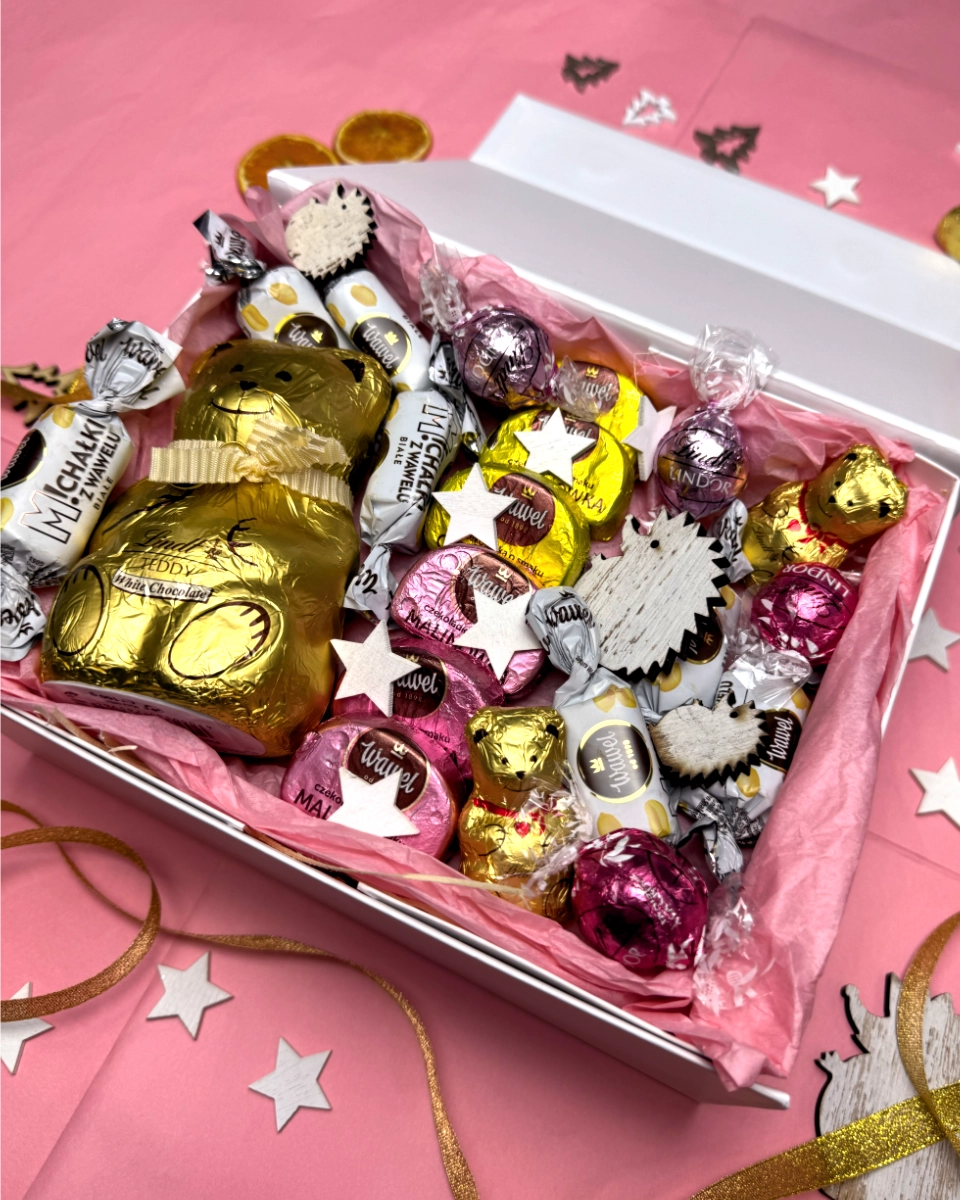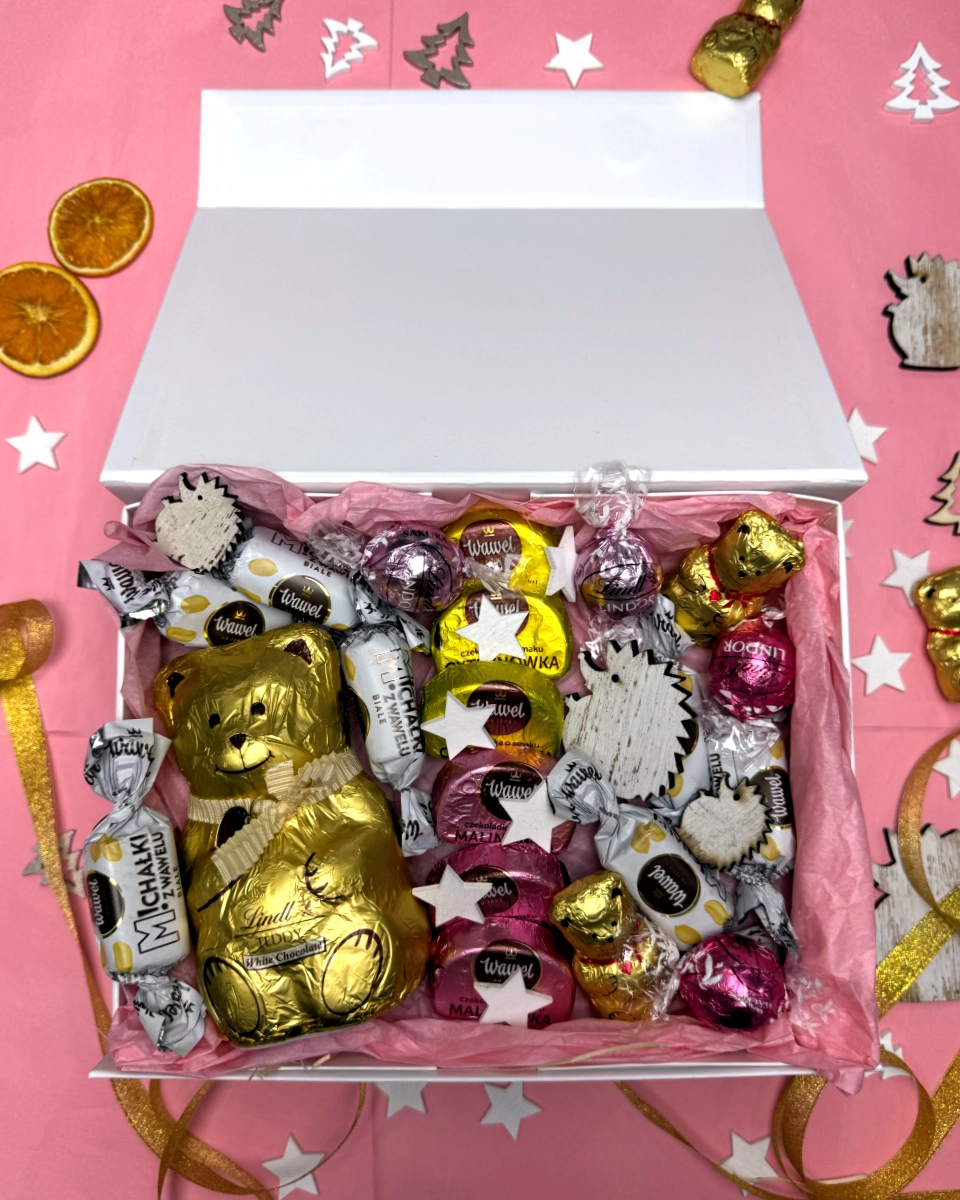 Radosny, kolorowy zestaw pełen ulubionych słodyczy i uśmiechu! W środku czeka uroczy czekoladowy miś, który dodaje prezentowi ciepła i bajkowego charakteru. Całość starannie skomponowana w jasnym pudełku, ozdobionym wstążką i świątecznymi dekoracjami. Idealny prezent dla dziecka – słodki, bezpieczny i pełen magii Świąt.