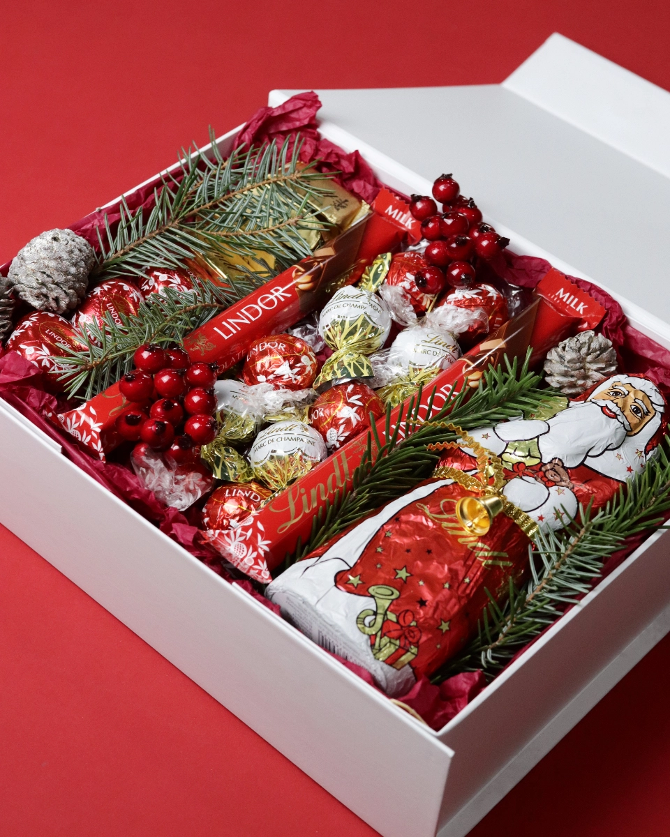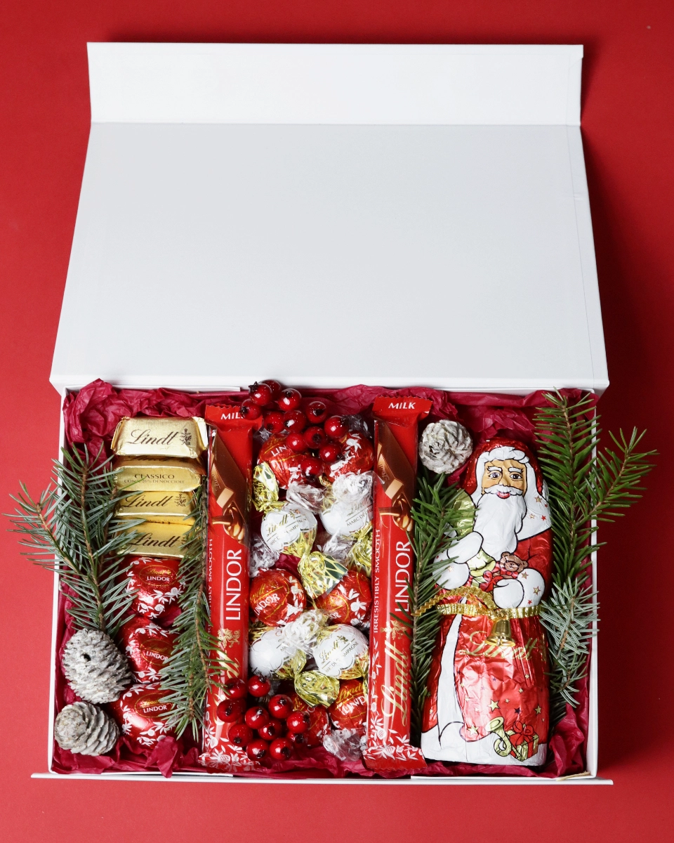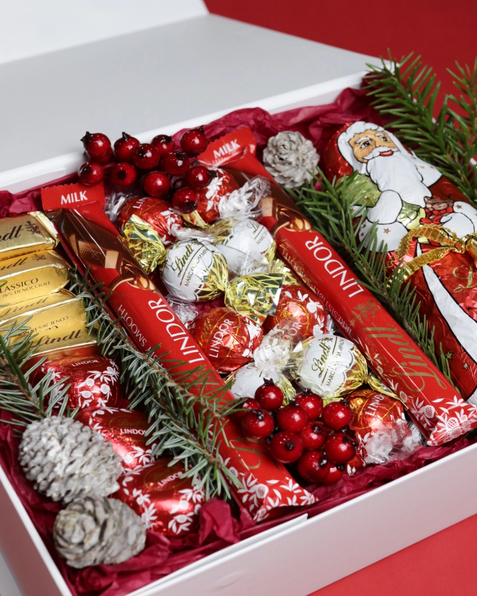 Klasyczny, świąteczny prezent w biało-czerwonej oprawie – elegancja, tradycja i ciepło w jednym. Pachnące gałązki świerku, złote akcenty i słodycze Lindt tworzą wyjątkową kompozycję, która oddaje magię polskich świąt. Idealny upominek dla bliskich lub partnerów biznesowych.