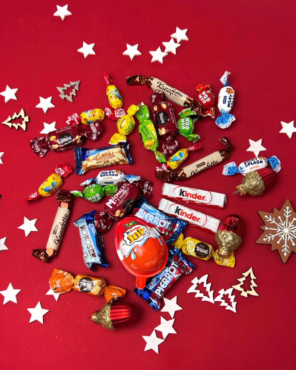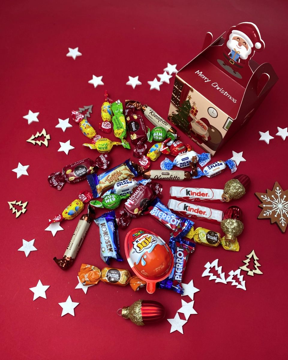 Każdy zestaw zawiera asortyment cukierków, batoników, czekolady i innych słodyczy. Skład zależy od wybranego zestawu. Szczegółowy opis znajduje się na stronie każdego produktu.