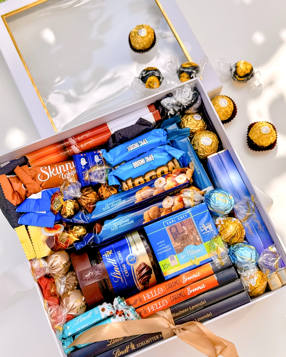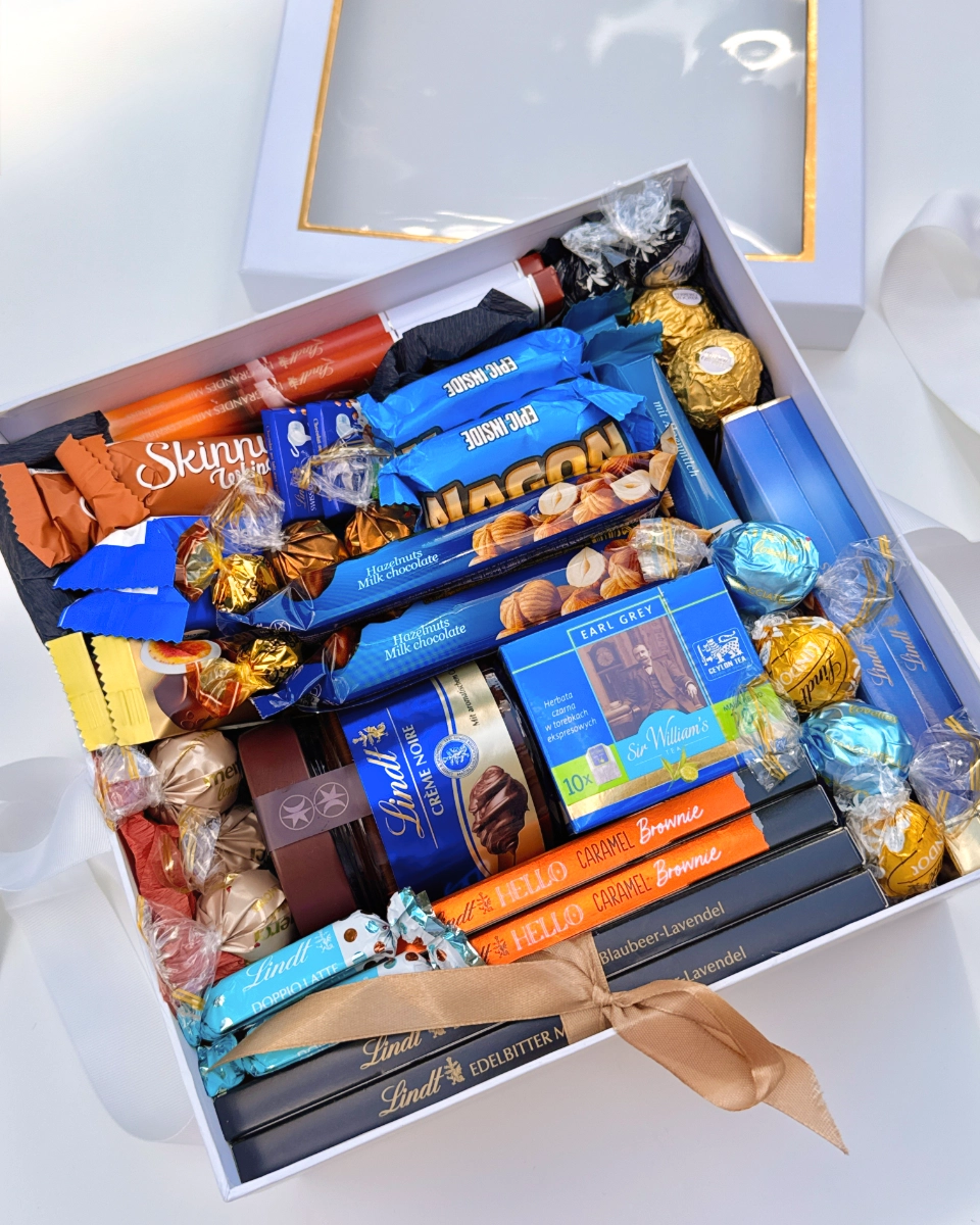 Elegancki zestaw dla miłośników wyrafinowanej czekolady i klasycznych herbat. Połączenie tabliczek Lindt, batonów Double Decker i Golden Nut, pralin Ferrero Rocher oraz delikatnych kulek Lindor tworzy kompozycję pełną różnorodnych smaków. Całość uzupełniają galaretki Wawel w czekoladzie i aromatyczna herbata Sir William’s Earl Grey, co sprawia, że prezent zachwyca zarówno wyglądem, jak i smakiem.